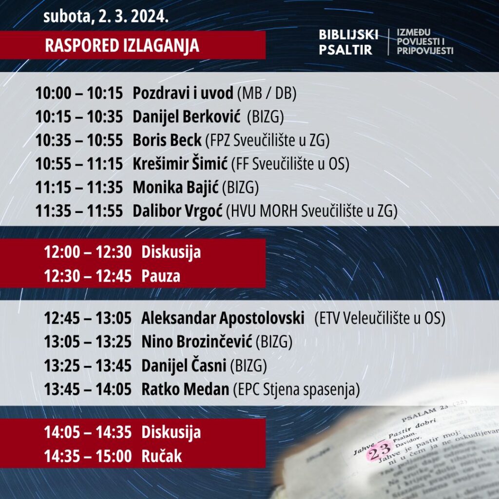 Pozivamo vas na znanstveni skup “Biblijski psaltir: Između povijesti i pripovijesti” u subotu 2. ožujka 2024. u prostoru čitaonice Biblijskog instituta u Gajevoj 9a (2. kat) u 10 h.